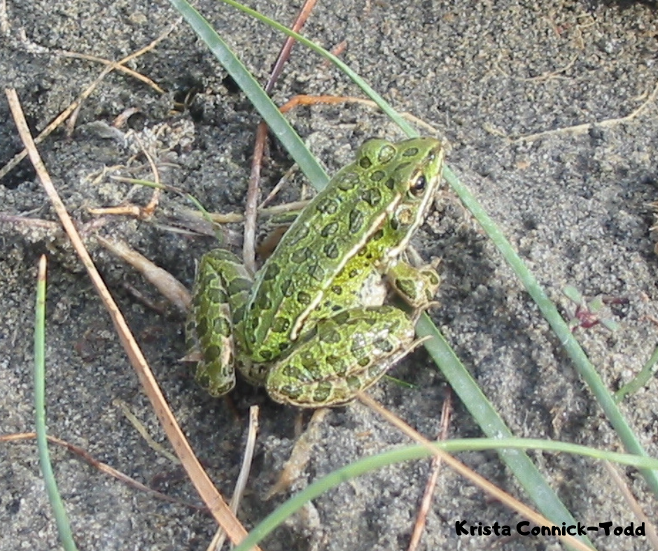 The Northern Leopard Frog varies in color from light green to pale brown. The most prominent identifying feature is its dark round spots, like that of a leopard. However, sometimes this frog will only have spots on its legs, or none at all! It also has pinkish folds running from the back of the eye down the back, and from under the nostril to the shoulder.